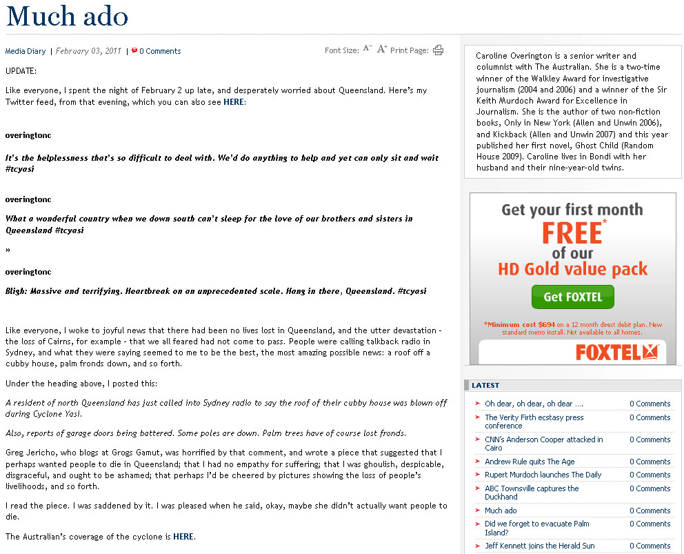 As you can see, Overington has “updated” her page. True, she does flag this at the very top by beginning with the word “UPDATE” but, hang on, what exactly is it updating? The original post — those two paragraphs which upset so many people — now appear to have been completely removed. Oh, wait, I see what’s she done. There they are, italicised and re-quoted in the latter half of what essentially amounts to a brand new article, re-contextualised by self-quoted tweets demonstrating how much Overington did actually care about those in Yasi’s path, and finally a clarification of what those two paragraphs were about: